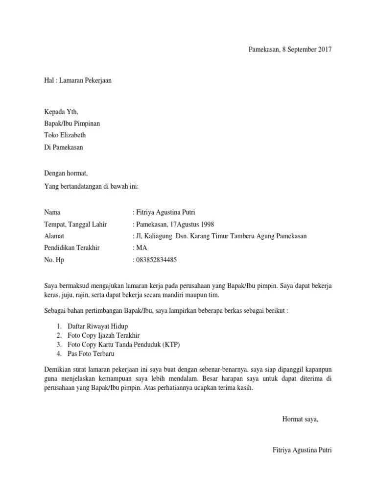 Pas foto terbaru 4 x 6 : Foto copy kartu tanda penduduk (ktp). Bersama ini saya lampirkan : Fotocopy ijazah & transkrip nilai; Surat keterangan keahlian / sertifikat; Fotocopy ijazah d3 dan transkrip nilai. Daftar riwayat hidup / cv; Foto copy kartu tanda penduduk. Contoh surat lamaran kerja ke toko baju bagi contoh surat from s2.bukalapak.com apalagi bila anda sudah berkeluarga dan anda adalah seorang suami. Demikianlah surat lamaran permohonan pekerjaan yang saya . Saya melampirkan berkas sebagai bahan pertimbangan : Mengajukan lamaran pekerjaan sebagai karyawan di perusahaan yang bapak/ibu pimpin. Foto copy ijazah s1 telah dilegalisir;